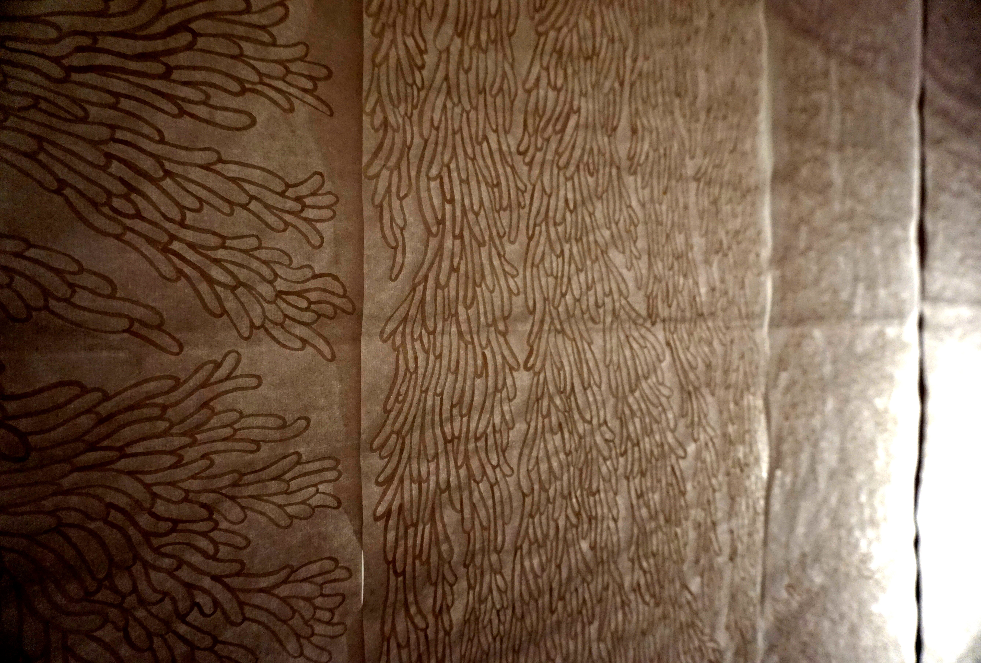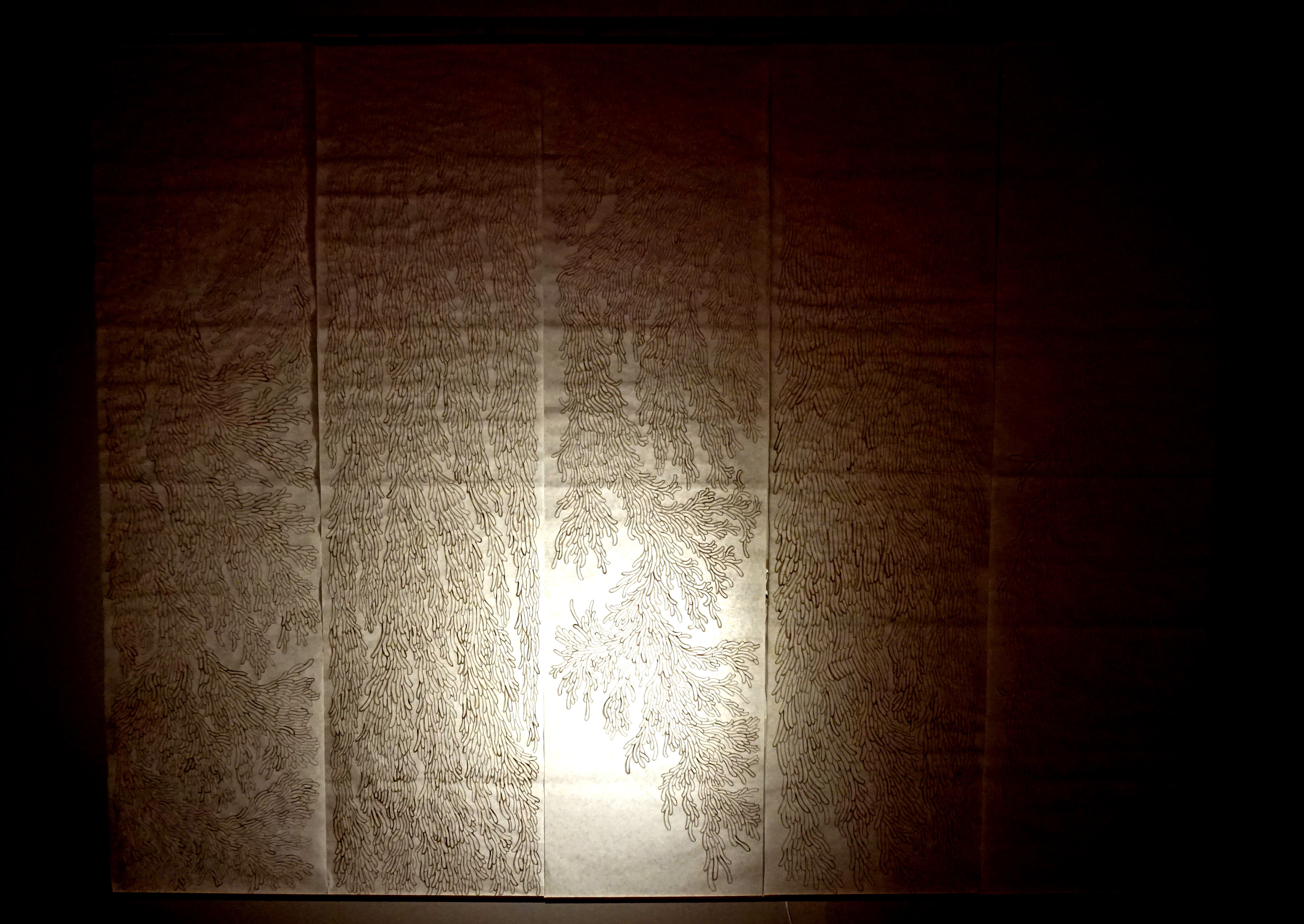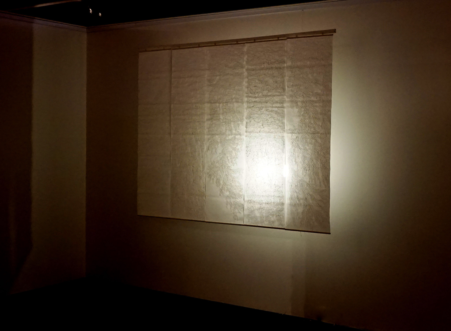 Painting on paper 175x140cm, Washi paper, white ink, wood, light